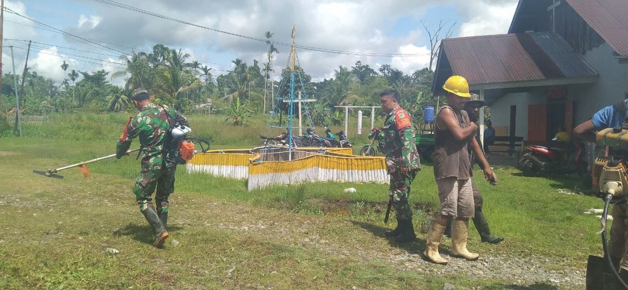 IPNews. Timika. Pererat tali silaturahmi dalam kerukunan umat beragama, Babinsa Koramil 1710-07/Mapurujaya melaksanakan kerja bakti pembersihan Gereja Katholik Santa Theresia Calkuta Kp. Muare, Distrik Mimika Timur, Kabupaten Mimika, Sabtu (4/2/2023).