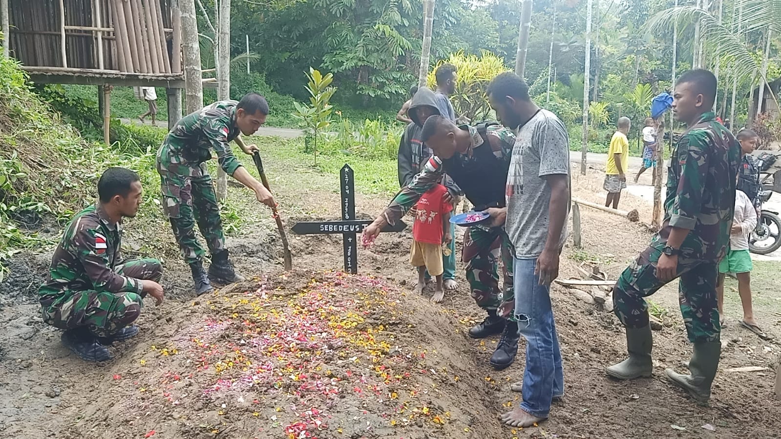 IPNews. Keerom. Prajurit Satgas Pamtas RI-PNG Yonif 126/KC membantu proses pemakaman salah satu warga meninggal dunia karena sakit di Kampung Sach, Distrik Waris Kabupaten Keerom.